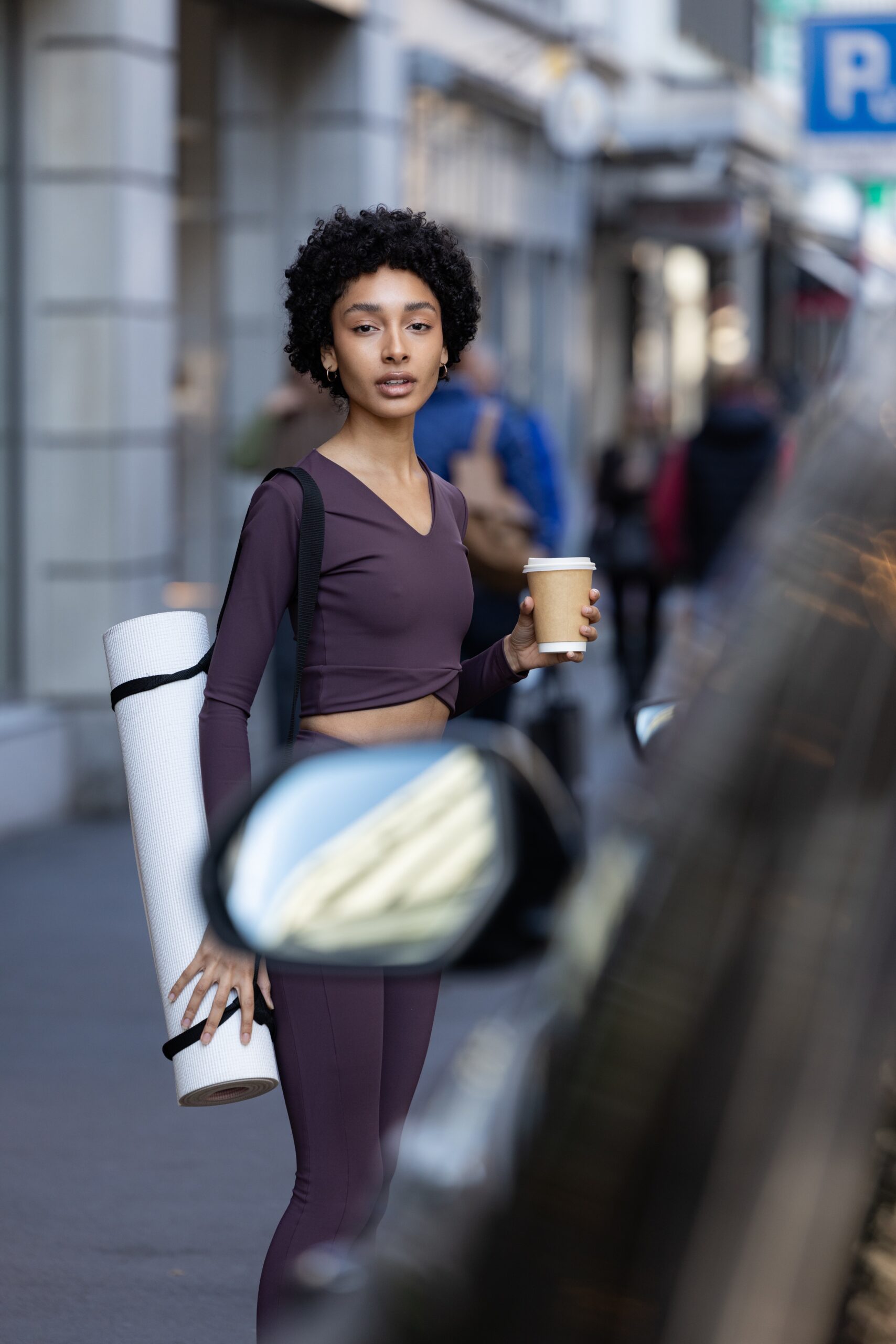 This two-piece set features a long-sleeve wrap top with a feminine V-cut and high-waisted shaping leggings that move effortlessly with you — from studio flow to street chic.