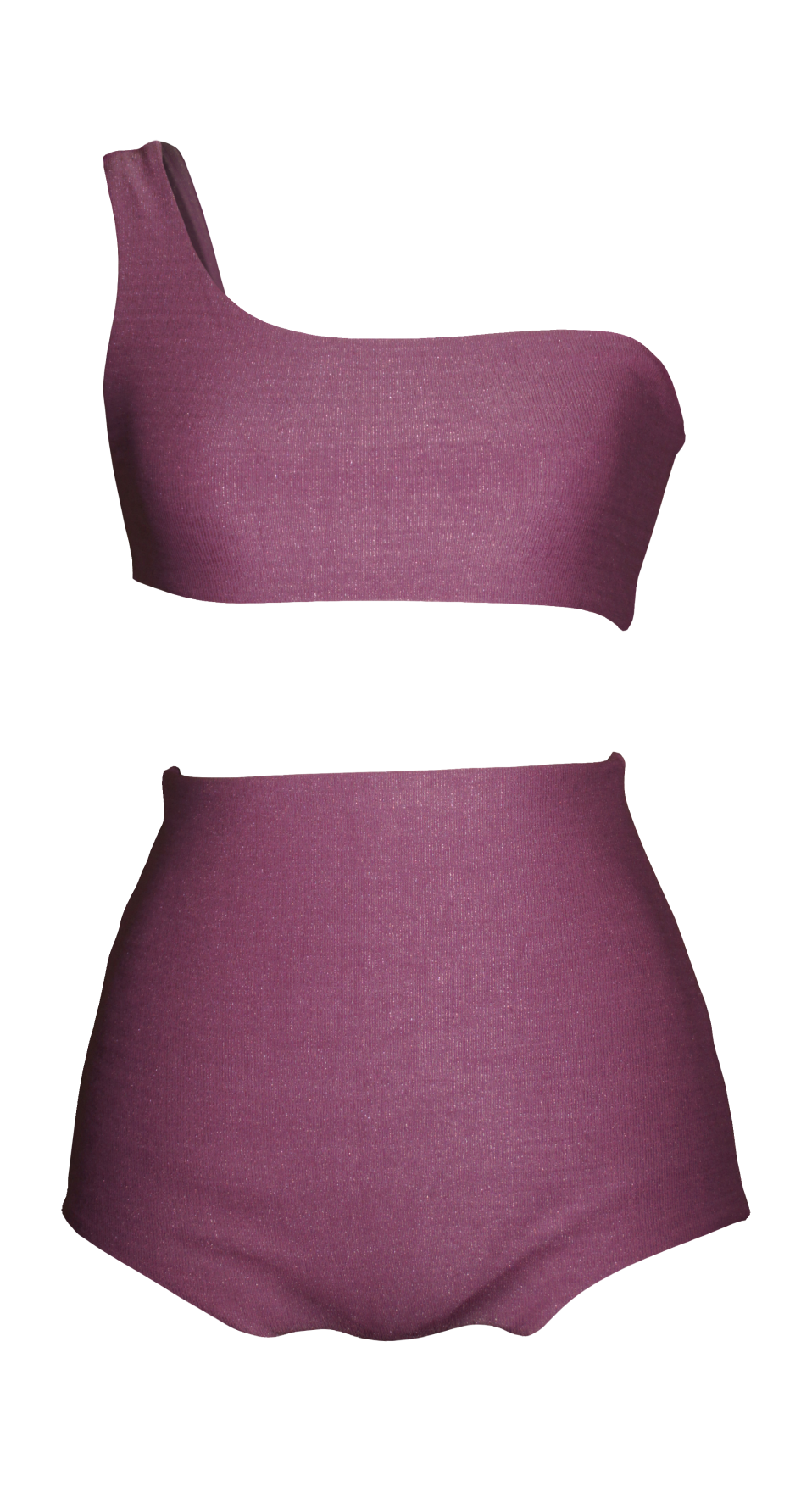 Channel your inner doll with the Barbie set, a bikini that blends chic vintage vibes with bold, modern flair. This one-shoulder bandeau top paired with flattering high-waisted bottom gives you that hourglass look – no effort required. The textured mauve fabric adds a playful pop of personality, perfect to combine your look for pool parties or days at the beachside.