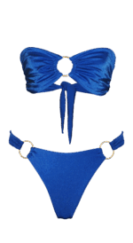Embrace the beauty of nature with the Trilobal Mar, a stunning bikini inspired by lush beauty of the ocean and coastal serenity. Designed in a rich tropical blue, this set features a bandeau top with delicate ruching and gold ring accents for a touch of glamour. The high-cut bottom elongate the legs while ensuring a flattering, sculpted fit. Crafted from premium trilobal fabric, it catches the light with a subtle shimmer, adding a luxurious feel to your beachside look.
